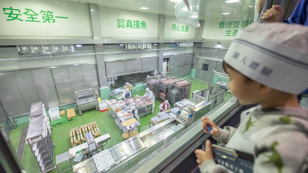 溪和水產的產線包裝區,特地將空間挑高至 7 公尺高度,讓參觀的遊客可以在二樓漫畫區旁,透過透明展示窗看到產品的包裝過程。品牌漫畫展、包裝產線展示以及漁撈廚房,整段互動式導覽約 10-15 分鐘。