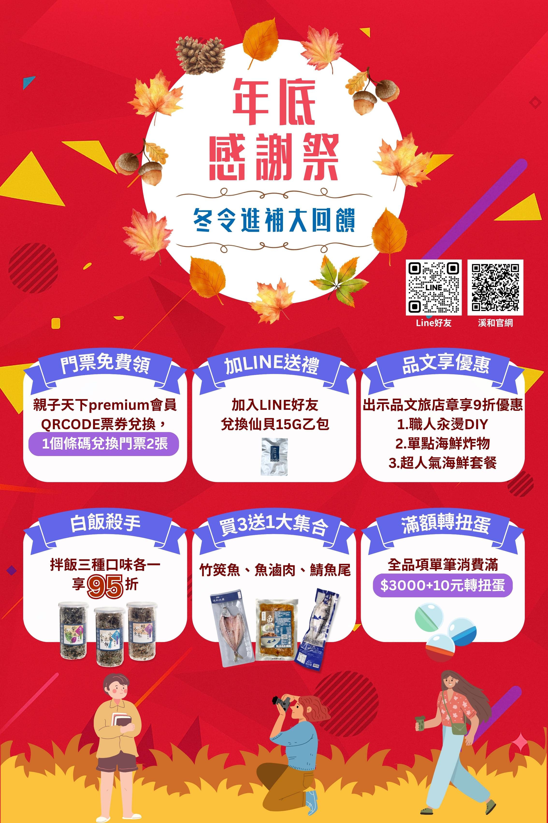✨觀光工廠11月連假精彩亮點✨ ✨工業區鱻味早餐限時推出✨ ✨品文旅飯店特別合作企劃✨ 🎁水產市集挑好禮🎁 ✨超值雙人親子套票$299✨ ✨半日遊手作DIY行程✨ ✨網友推薦超大隻現壓透抽✨ 不用到日本江之島就能體驗 小朋友最愛的米仙貝 🍘現點現做現壓超級香🍘 ✨現壓米仙貝及透抽仙貝✨ 打卡再贈仙貝餅乾(乙包) ✨海膳廚房新品上市✨ 趕緊揪團來嘗鮮