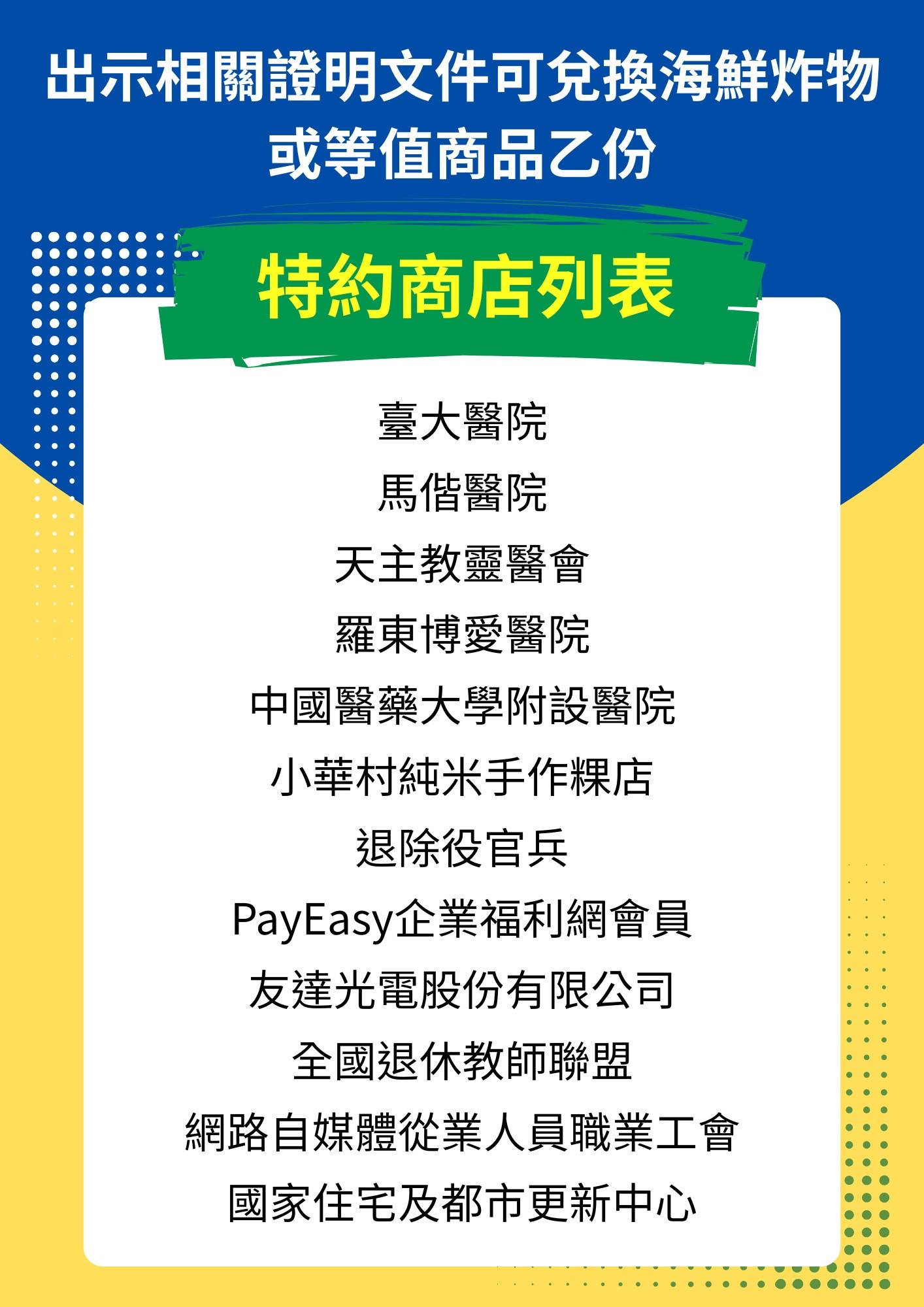 溪和水產為國旅卡特約商店,歡迎使用~ 出示PAYEASY福利網的商家畫面,可兌換田媽媽海膳廚房炸物乙份~ 全國教育產業總工會憑福利卡可享實體門市專屬優惠 憑小華村純米手作粿店發票可兌換海鮮炸物乙份 歡迎各大企業與我們合作成為特約商店 加入溪和官方LINE@洽詢合作方式 (點我加好友)