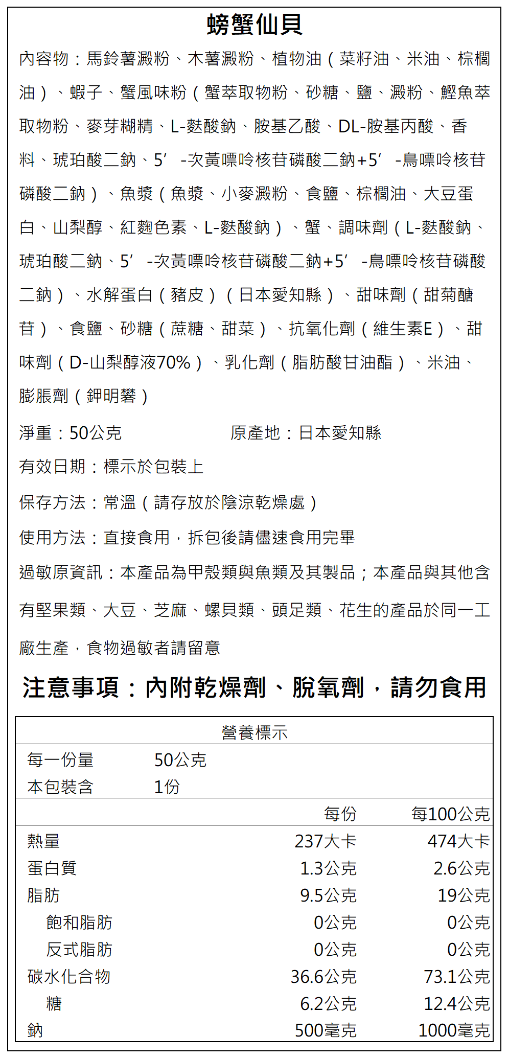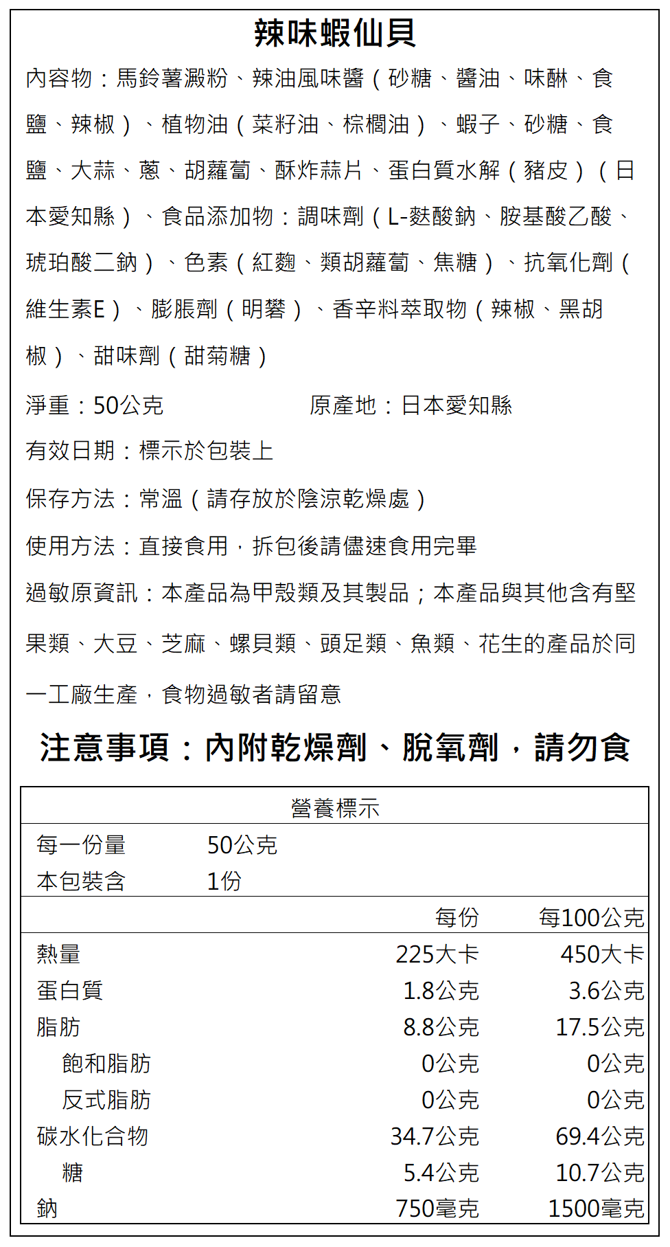 2.本產品為甲殼類及其製品;本產品與其他含有堅果、大豆類、芝麻、螺貝類、頭足類、魚類、花生的產品於同一工廠生產,食物過敏者請留意。
