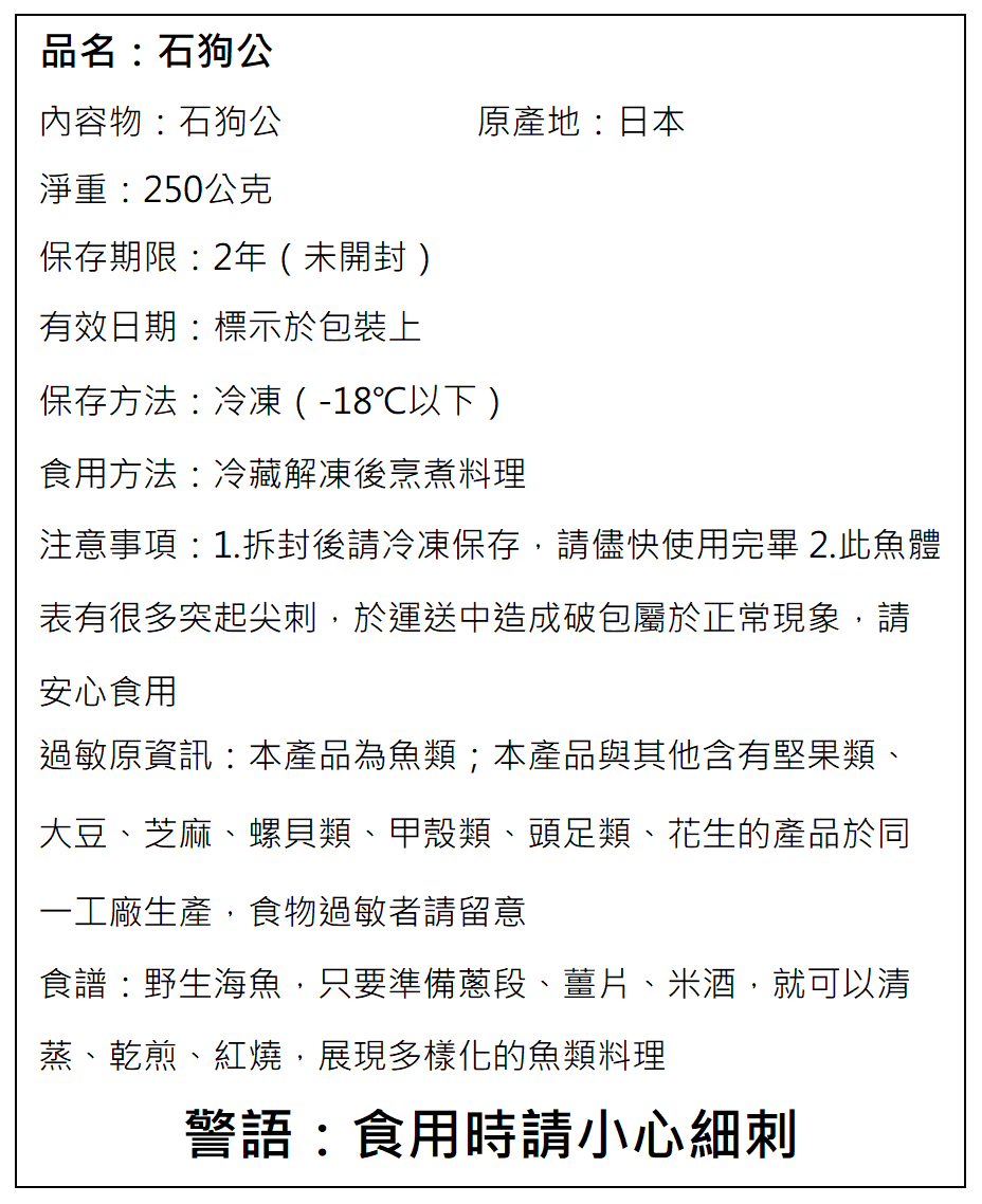 2.本產品為魚類;本產品與其他含有堅果類、大豆、芝麻、螺貝類、甲殼類、頭足類、花生的產品於同一工廠生產,食物過敏者請留意。