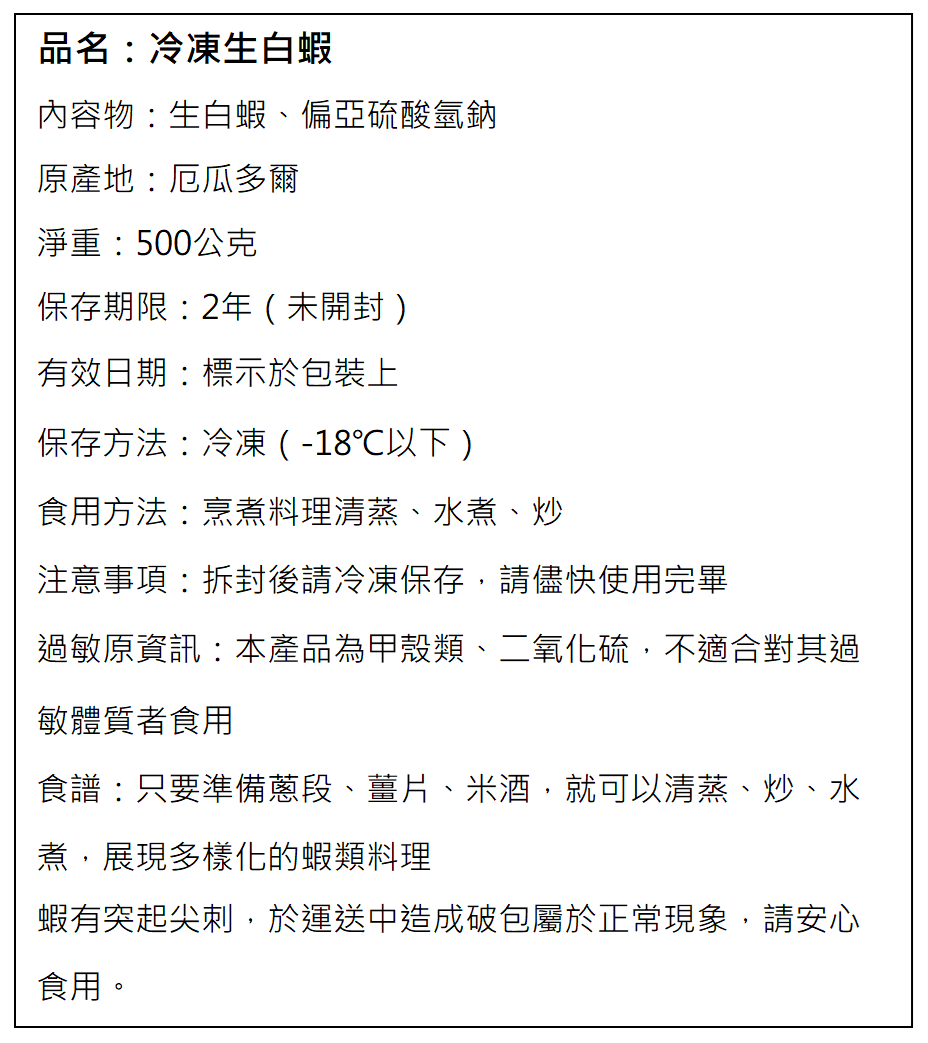 2.本產品為甲殼類、二氧化硫;本產品與其他含有堅果類、大豆、芝麻、螺貝類、魚類、頭足類、花生的產品於同一工廠生產,食物過敏者請留意。