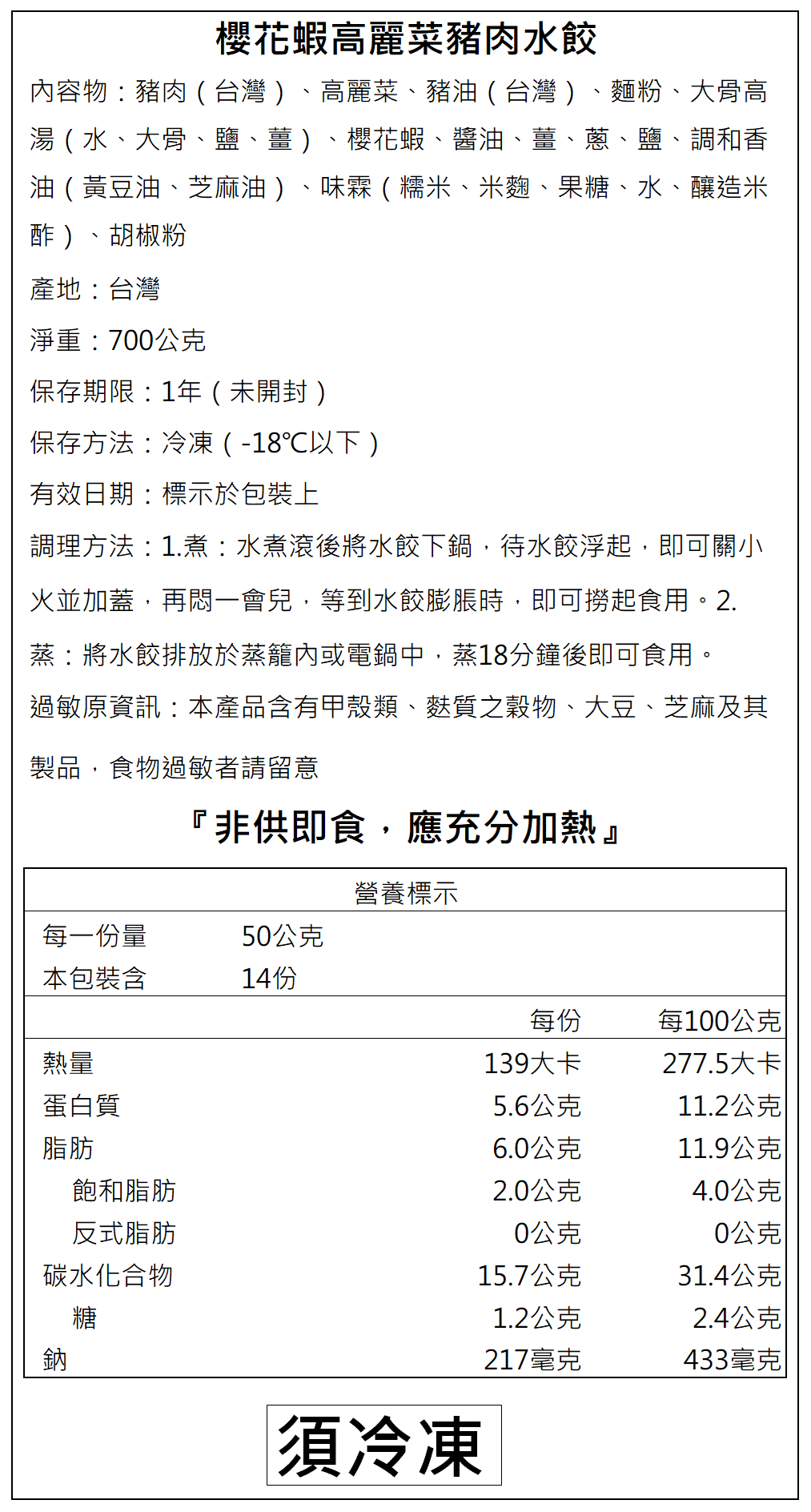 2.本產品為甲殼類、麩質之穀物、大豆、芝麻及其製品,食物過敏者請留意。