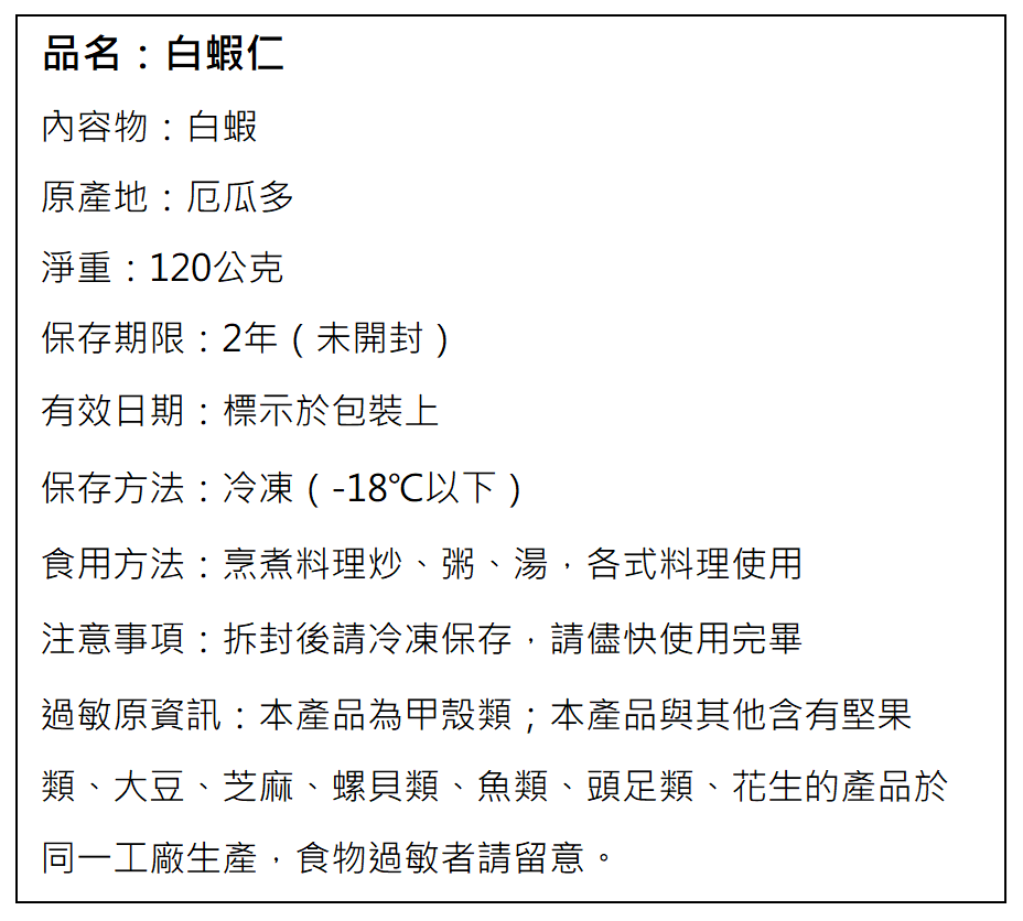 2.本產品為甲殼類;本產品與其他含有堅果類、大豆、芝麻、螺貝類、魚類、頭足類、花生的產品於同一工廠生產,食物過敏者請留意。