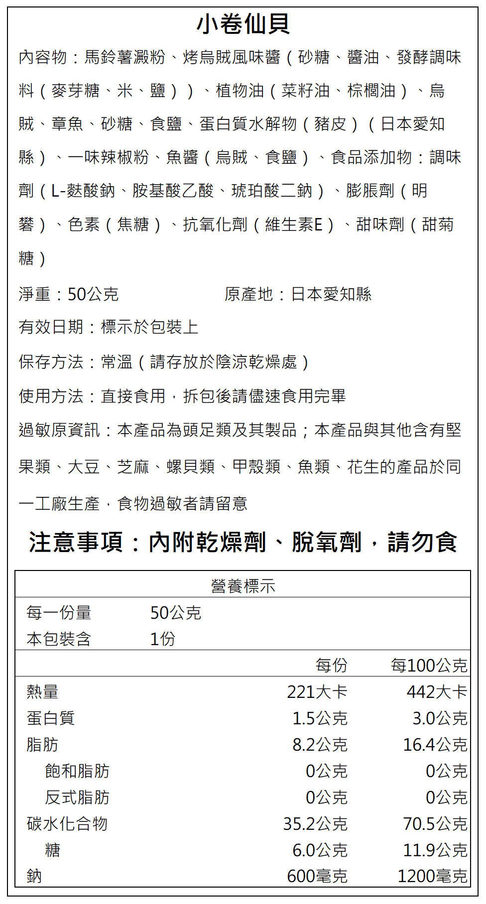 2.本產品為頭足類及其製品;本產品與其他含有堅果、大豆類、芝麻、螺貝類、甲殼類、魚類、花生的產品於同一工廠生產,食物過敏者請留意。