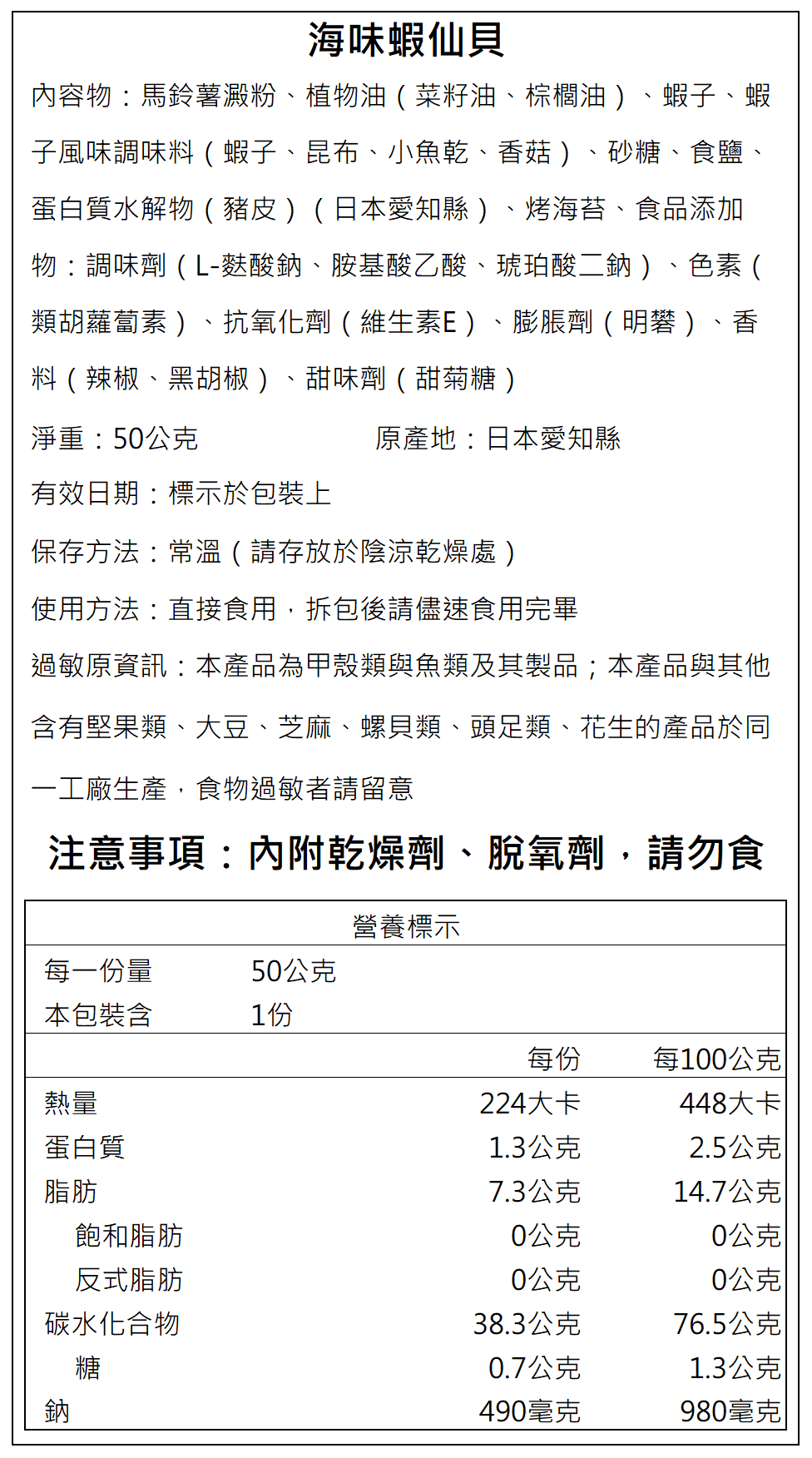 2.本產品為甲殼類及其製品;本產品與其他含有堅果、大豆類、芝麻、螺貝類、頭足類、魚類、花生的產品於同一工廠生產,食物過敏者請留意。