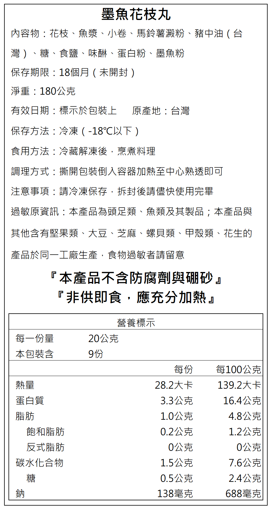 2.本產品為頭足類、魚類及其製品;本產品與其他含有堅果類、大豆、芝麻、螺貝類、甲殼類、花生的產品於同一工廠生產,食物過敏者請留意。