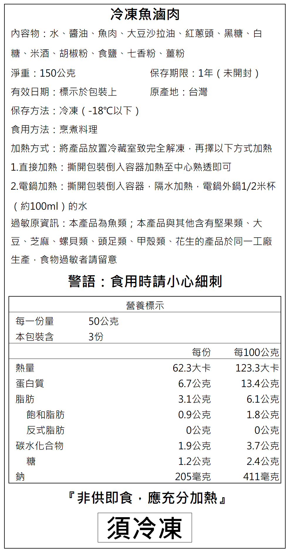 2.本產品為魚類及其製品;本產品與其他含有堅果類、大豆、芝麻、螺貝類、甲殼類、頭足類、花生的產品於同一工廠生產,食物過敏者請留意。