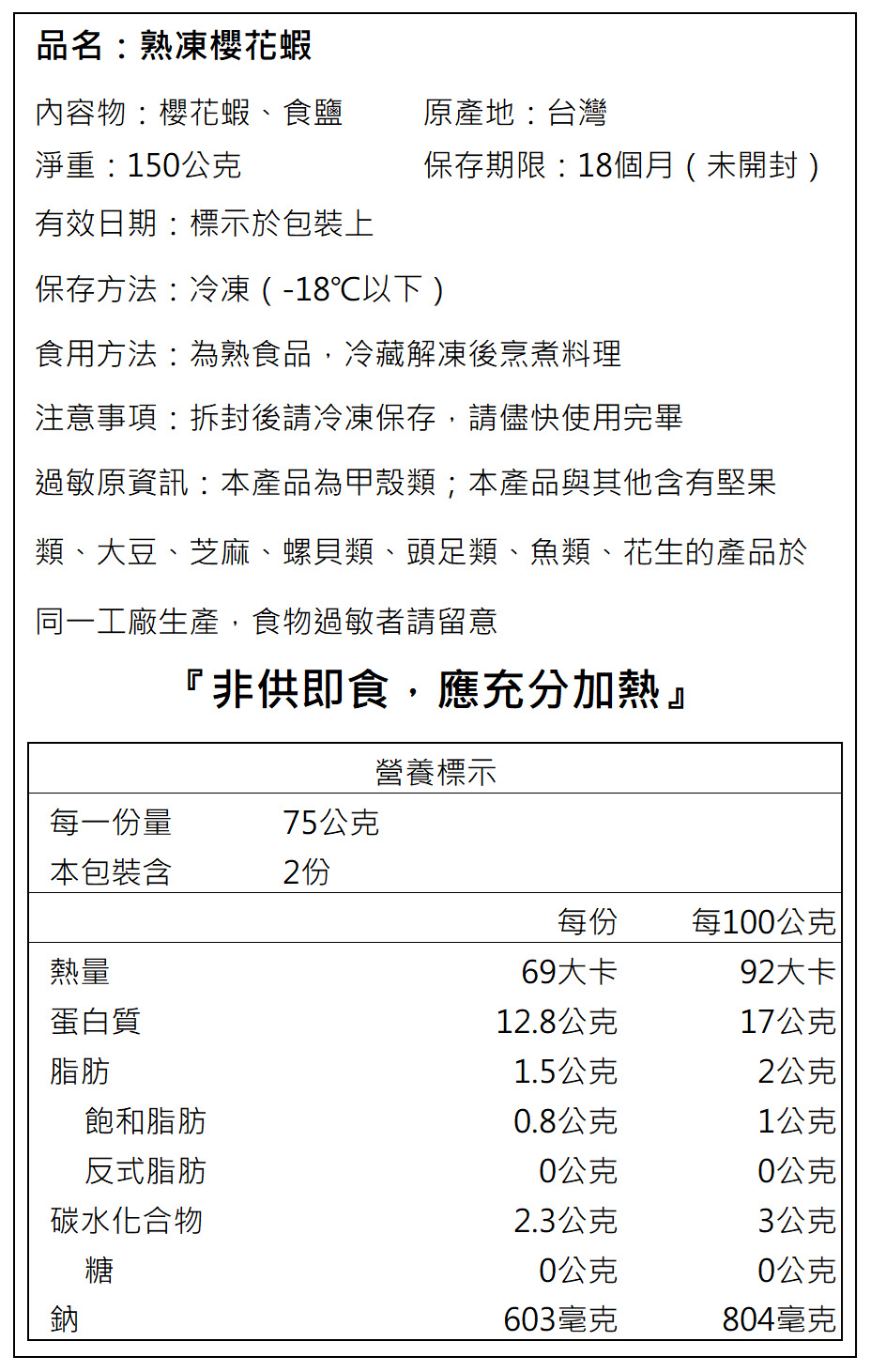 3. 櫻花蝦營養價值高,富含蛋白質、鈉、鉀等維生素,不管是直接食用或是在料理中提鮮,都是很棒的食材。本產品無添加防腐劑及色素,可安心食用。